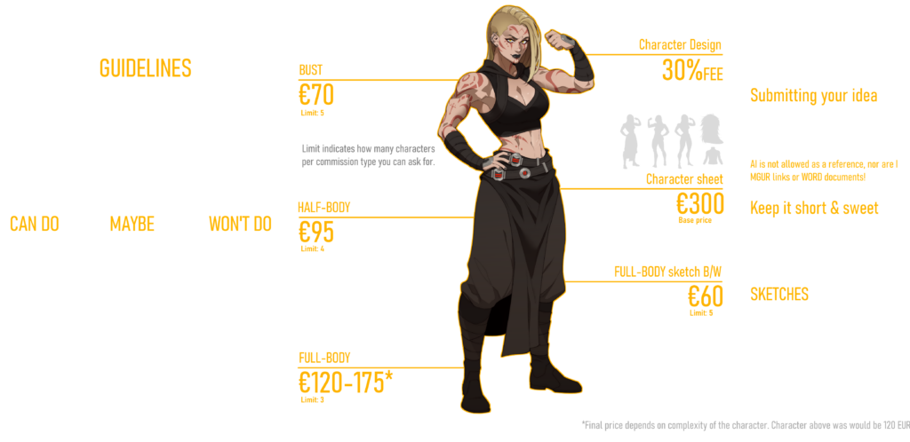 I am blessed to say there’s always something for me to work on, which means that commission ‘slots’ are usually filled. I work in batches, with the aim to finish them within one to two months time, however the exact time and size of a batch varies based on multiple factors.